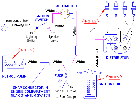 For negative earth conversion, swap the two primary terminals on the ignition coil, and modify the tachometer for negative earth operation.