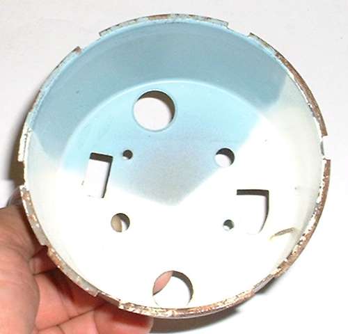 On the left we have the instrument with the glass and glare shroud removed. On the right you see the empty case. Notice the white interior of the case with some light blue color in the upper part for about 120 degrees surrounding the position of the illumination lamp. This blue area serves to dim the illumination a bit near the bulb to even out the lighting somewhat around the face. It also gives the illumination a slight blue tint.
