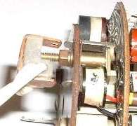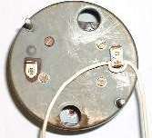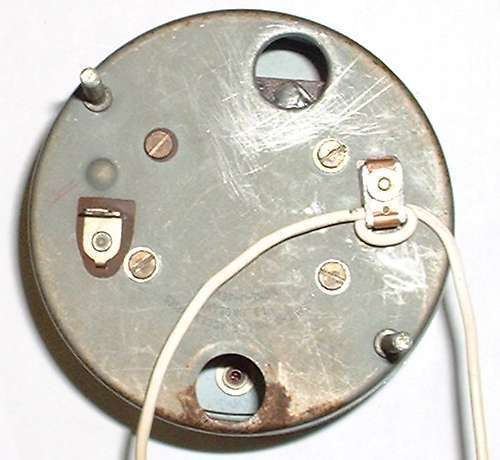 For disassembly remove front glass as noted above and the induction loop bracket. Then remove the two screws on the back of the unit that hold the internals to the case (not the two whose heads fit in holes in the case), and allow the internals to drop carefully into your hand. Do not bend the needle! Once the case is removed the back of the internals looks like the picture at left. Notice the black knob at top just left of center with two white dots and a screwdriver slot in the center. This knob may be a different color (commonly white) in your instrument. This is the potentiometer used to calibrate the instrument for correct speed reading. [See photos and notes at bottom of page for external location of the calibration knob].