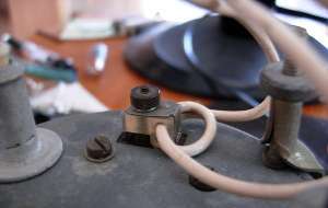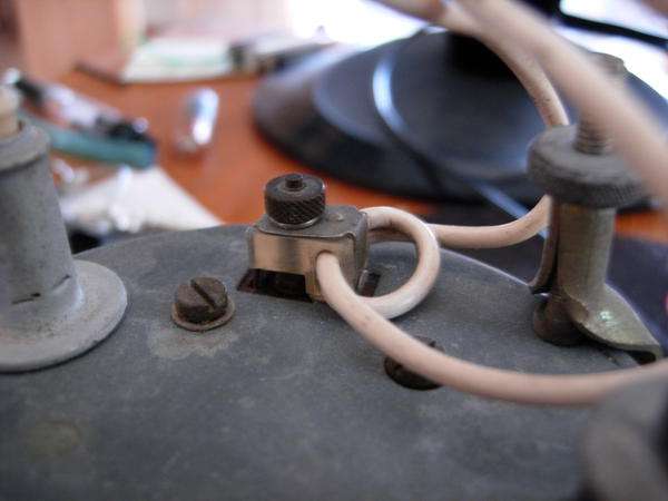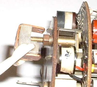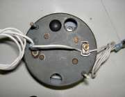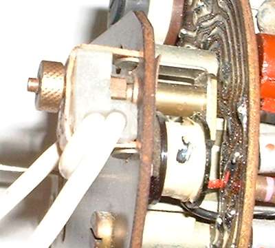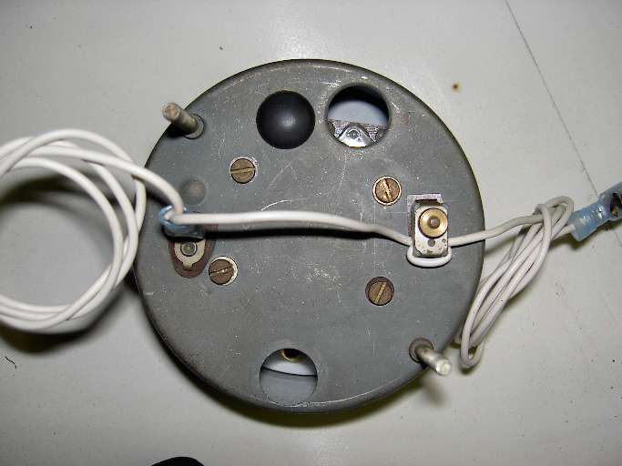 The picture at near right shows the back of the instrument with power terminal on the left and induction loop on the right. The white wire is part of the wiring harness running from the ignition switch to the ignition coil. To remove the instrument from the car without cutting the wire, remove the knurled nut, unplug the copper strap, and leave the nylon insulator on the wire (second picture).