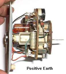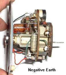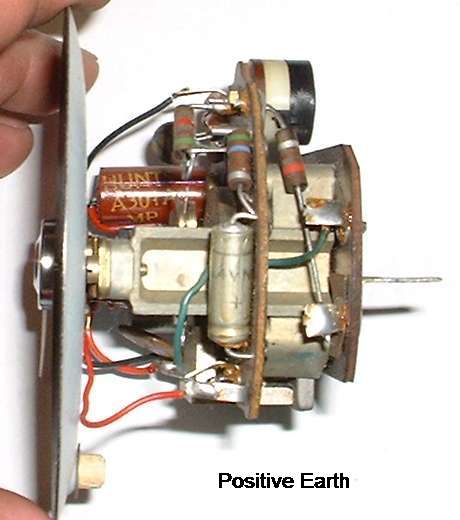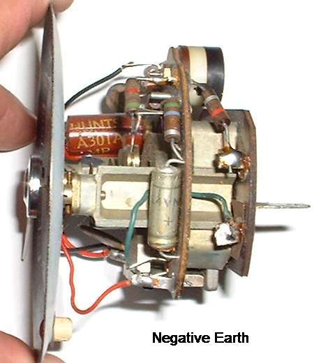 Un-solder the connections for the green wire and the large resistor on the rear circuit board tabs. Switch the ends and re-solder the connections. For original positive earth setup the resistor connects to negative power and the green wire connects to positive ground. For negative earth conversion the green wire connects to positive power and the resistor connects to negative ground. Internally the instrument then has the same electrical polarity with the green wire always being positive. Clean the glass and reassemble the instrument when finished.