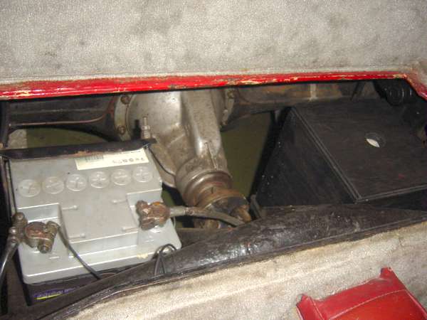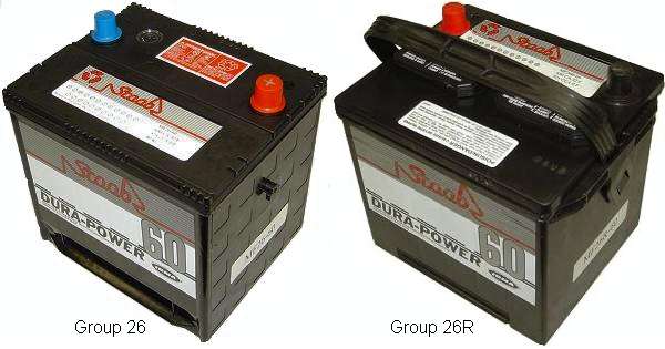 The smallest current commonly available 12 volt battery is the group 26, which is 6-13/16" wide x 8-3/16" long (7-3/4" tall including the posts). This will be very close to 8" long on the bottom, so the original carrier in the MGA needs to be lengthened about 1-1/2" to accept the battery and the rubber pads. Picture on the left shows a battery with the connector posts on the center line, so it is physically reversible. Many 12-volt batteries will have the posts in the corners on the same side of the battery. The group 26R is reverse polarity, which is the same as having the posts on the opposite side of the battery. The red cap is the positive post in this picture.