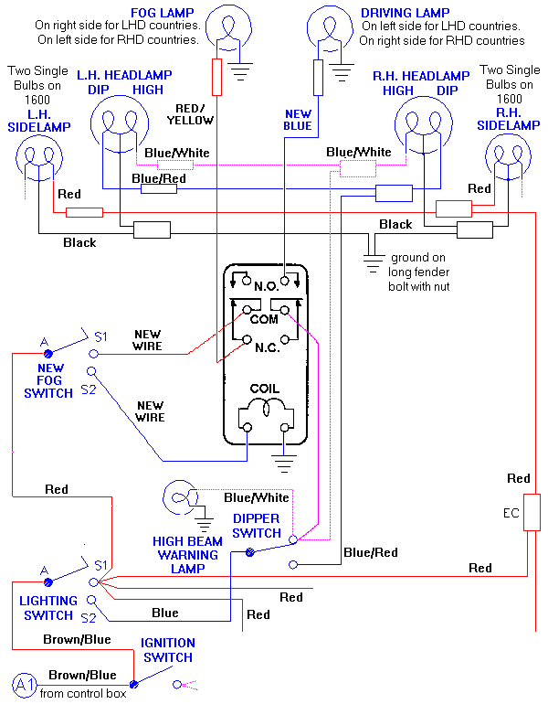 g.) Since Fog lamp and Driving lamp cannot be on at the same time, there is no additional load on the electrical system or on the lighting switch. Original system was designed to operate one Aux lamp in front. -- Note however that the Dipper switch and its input wire must now carry the electrical load of three front lamps on high beam, up to 15 amps. You might want run an additional 18 gauge wire in parallel to the original Blue wire to handle the additional 5 amps (more on that detail below).
