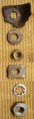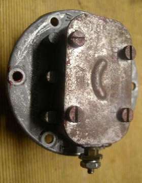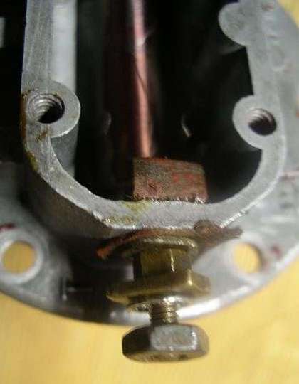 With the cover removed it will look like the picture at right. The fastening hardware on the bottom contact stud is shown at far right. From bottom up there is a hex nut (not original type), a lock washer, sometimes a flat washer (not shown), a square nut (jam nut), a hex nut, a flat washer, and an insulating washer. The threaded brass stud also has an insulating collar where it passes through the bottom of the sender shell, and another insulating washer (or phenolic block) inside the shell. These insulating washers may be just a thick piece of hard paper, or they could be fiber washers. The important points here are that the stud must be electrically isolated from the case, and it must ultimately be sealed to prevent fuel leakage. Remove the various washers, nuts and finally the insulating paper. Carefully push the bolt into the sender unit being careful not the break the thin copper wire attached.