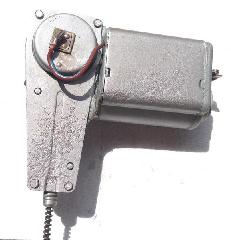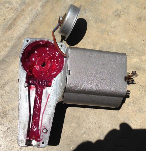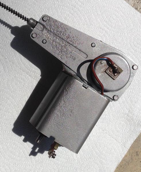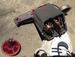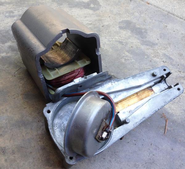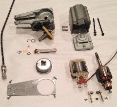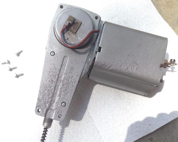 The new brushes installed. Note that I scavenged them from a non-working orbital sander that I had laying around. They were too long so I sanded them down to fit. The motor cover and long screws that hold the motor housing to the gear box are off to the side. |