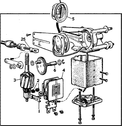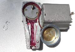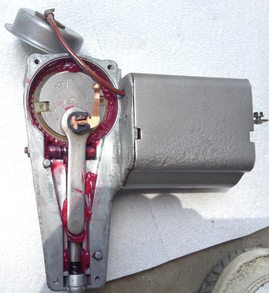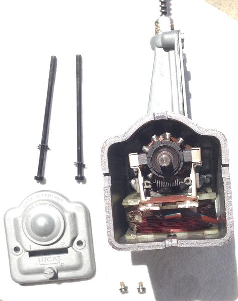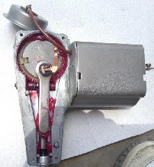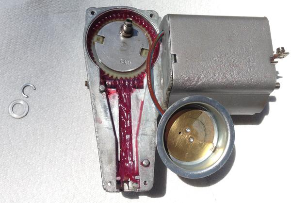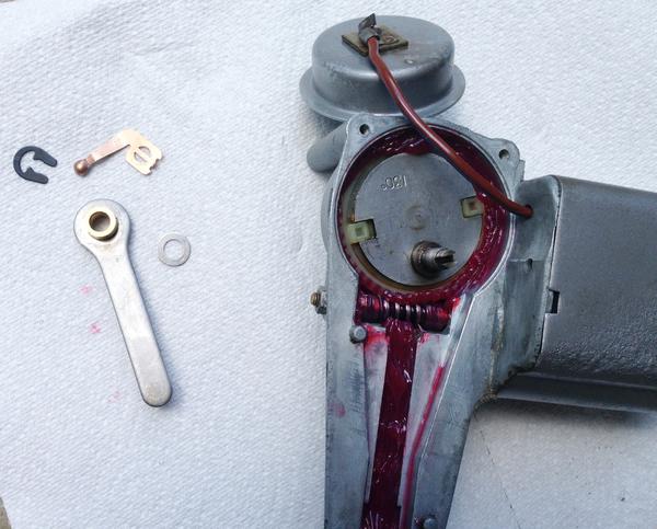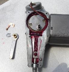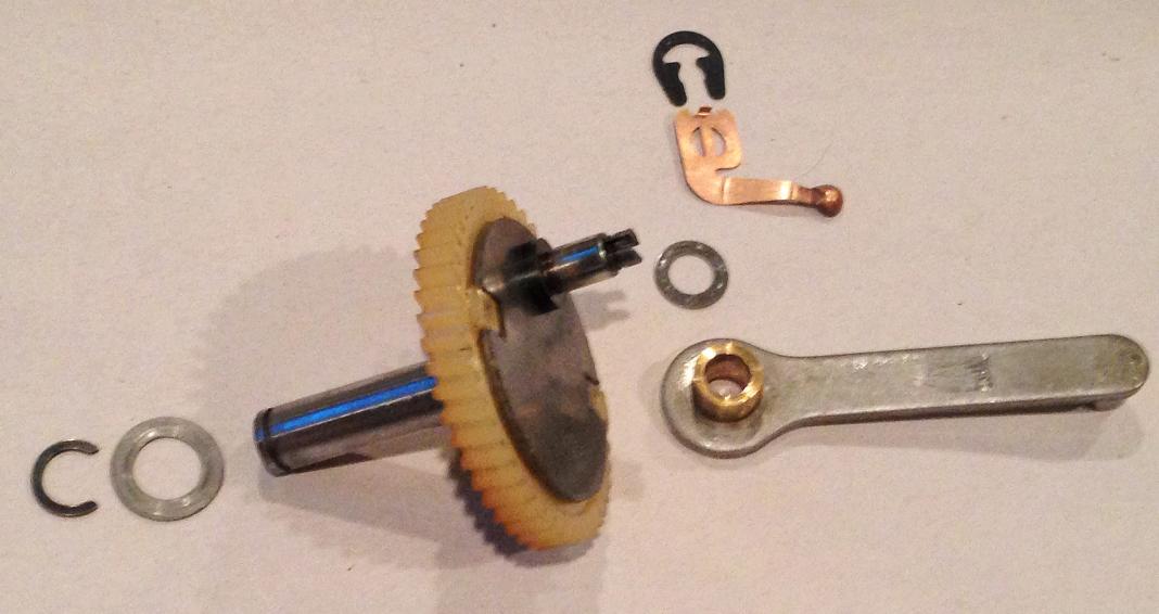 The assembly turned back over with the washer, crank link, parking commutator contact and circlip off to the side. |