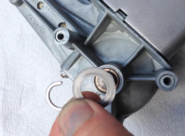 The bottom of the assembly where the crank gear shaft protrudes through. Here I am holding the washer that goes on before the circlip. |