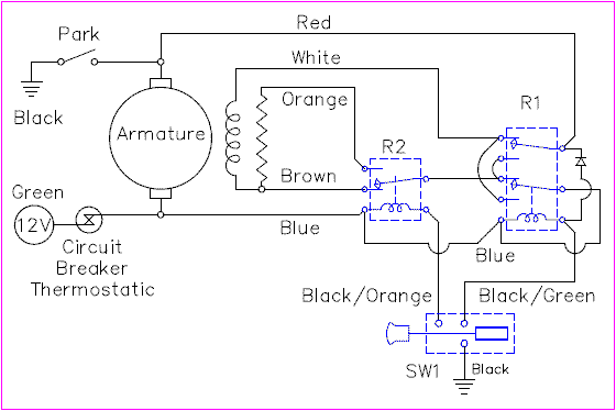 Remember that this motor parks by running backward to actuate a special cam that changes length of the drive cable. The diagram above shows the circuit "at rest" in the parked condition with the Park Switch open. No ground connection means it is not running. But it was last running in the reverse direction to get to this position. Reversing direction of rotation of the motor is done by reversing polarity of the field coil (swapping two wires on the field coil).