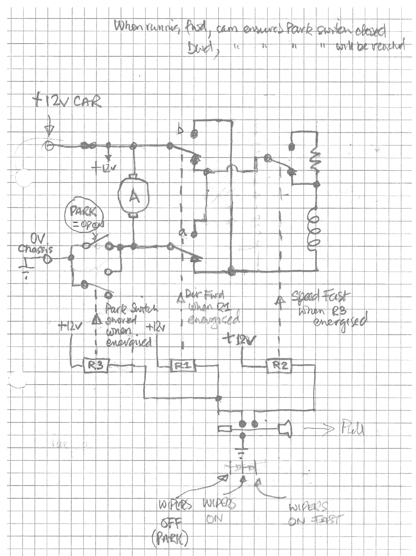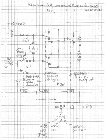 Direction of rotation is fixed during manufacture and will need to be adjusted so that the wipers will park on the pull stroke of the rack requiring different directions of rotation for LHD and RHD cars, and to do this it is necessary to strip the motor and unsolder and switch the connections on the RH and LH terminals shown in the circuit in ET-219D. To avoid this, the Blue and Red wires were taken to the exte-rior of the motor where they can be switched (along with the Black wire to the parking switch) without dismantling the motor.