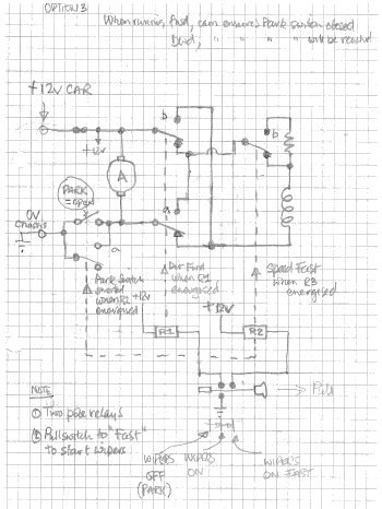 Option 1 is not shown. Option 2 will start the wipers at low speed. Option 3 will start the wipers at high speed. The circuits are shown below. If I were using the relay option I would use Option 3.