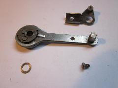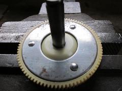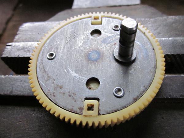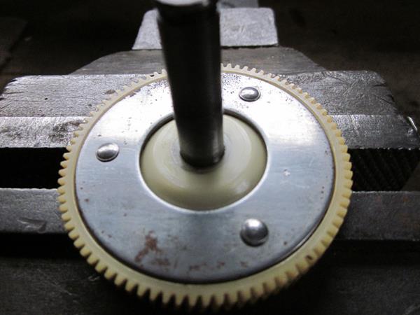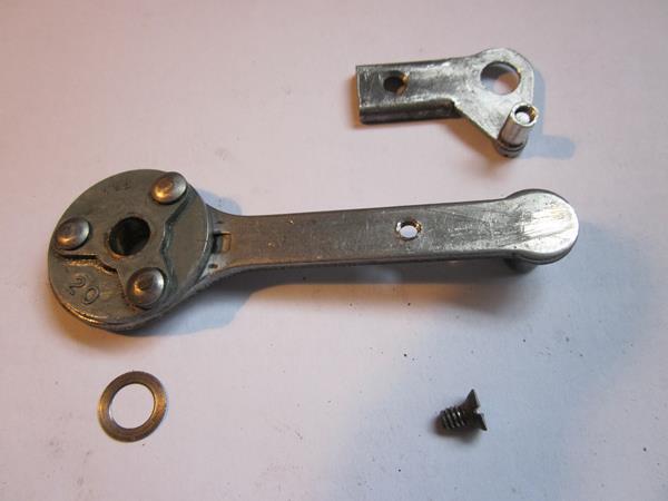There was not sufficient length remaining in the 3 rivets which attached the crank to the nylon gear wheel so 1/8” pop rivets were used. The crank is a tight fit in the wheel and rotational forces are trans-mitted through the dogs on the wheel. The rivets were not popped but cut down and peened over.