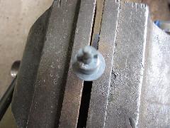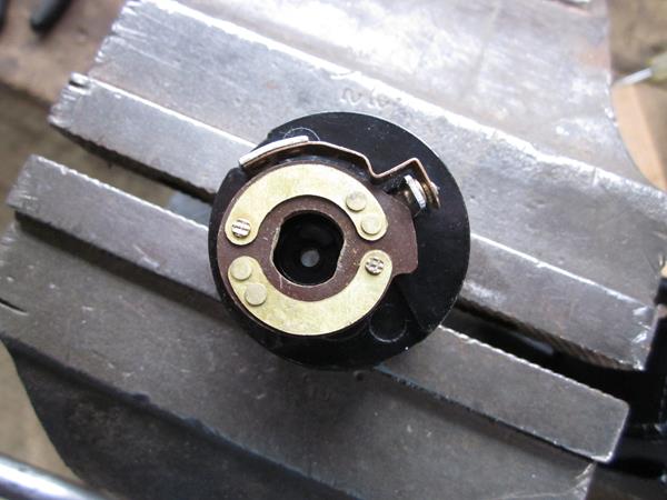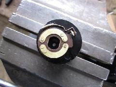 The armature on the PRS5 is a drum with a quadrant removed and this quadrant has to be made into a semicircle. The armature is a light alloy pressed onto a steel spindle. I tried to remove the spindle so that the modification would be a straight filing job, but no way and I did not want to break my precious switch so I had to remove the alloy with a very sharp wood chisel. I set up the armature in a piece of tube gripped vertically in the vice and chipped away to get the shape shown. In fact, the shape is a sector just short of a semicircle, as the centre picture in the bottom row, as this gives more positive switching.