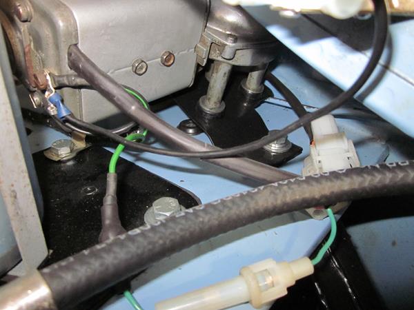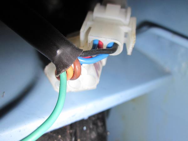 Switchable wires connect in the upper plug with motor tails entering from the right and exiting to the harness to the dash. The lower plug, above right, has Orange, Brown and White wires from the motor and Green power in from the existing harness. The unused Green/Black wire is terminated on the motor earth screw to keep it safely out of the way.
