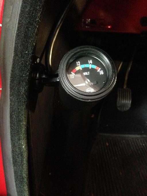I installed a voltmeter. I had been trying to find an easy to view place to put it that didn't alter the stock appearance. It came out pretty well. I have a generator with a stock control box. The voltage is generally between 14 and 15v while running at speed. Idling with the headlights on for a while and you can see it drop down to around 12. The needle fluctuates about 0.2v as the blinkers blink. This makes me think there has to be some resistance in the ignition switch. The voltmeter is connected to the second blade connector on the switched side of the ignition switch [MGB or aftermarket type ignition switch].