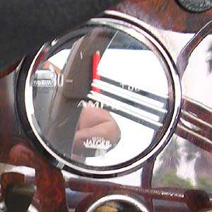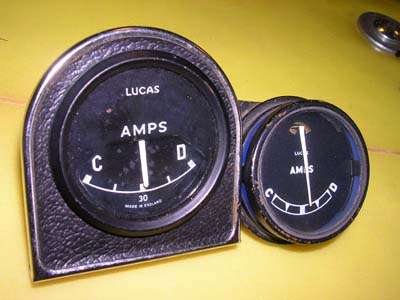 Another more common LUCAS ammeter also fits well: the font lettering is a closer match although the scale increment markings are not. Rear-mounted illumination works better but does not match the side-illumination of the original gauges. This gauge also features the nice minus-to-plus scale.