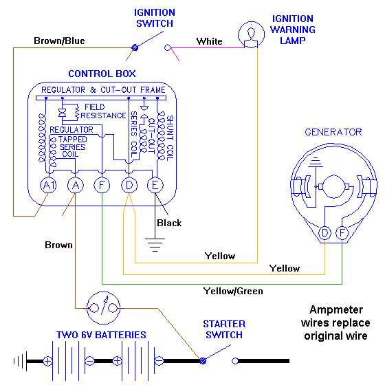 "It is the fat brown wire running from the starter switch to control box terminal "A" which carries all this current, both for power draw and for charging the battery. Disconnect one end of this wire and connect the ammeter in series. This requires running the heavy current wires through the bulkhead and under the dash in the passenger compartment. Be very careful not to cause a short circuit anywhere, as this would be a direct short from battery to ground on a high current circuit (generator output included). That's what causes big sparks and fires. This is why the vintage type ammeter is not terribly popular".