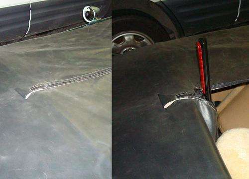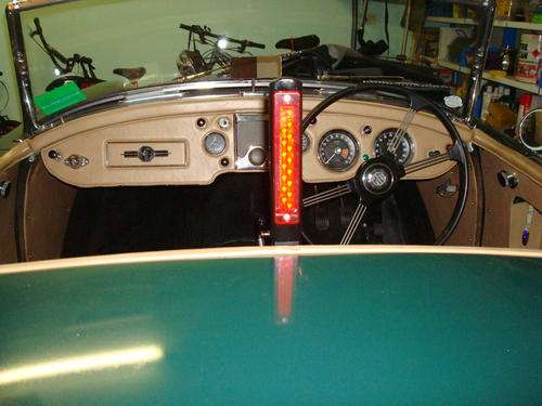 "Here is my new third light. It is a 120mm tall led light from 'LED Technologies' (25R12) mounted in a post which folds down between the seats when the tonneau is closed. I have wired the light to be on as a running light as well as the brake light. It's bright, unobtrusive when not on, but very bright when ON. The folding post is held in place with a small spring to the side and an aluminum bracket fixed to the rear of the rail of the cockpit".