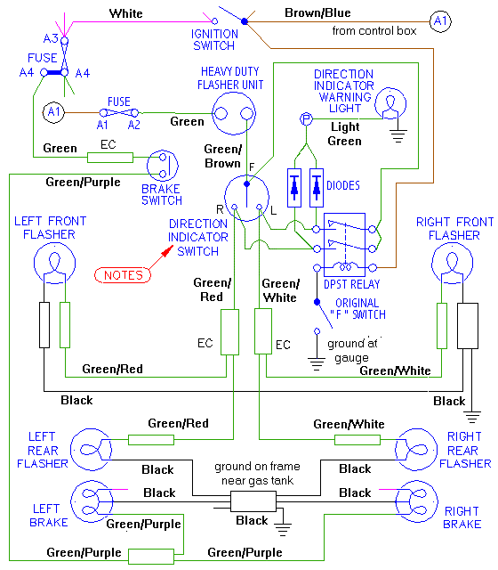 The new heavy duty flasher most likely will not have a pilot lamp output terminal. To compensate for this you can add two diodes (cheap from RadioShack). Connect the diodes to the left and right turn signal lamp circuits. The easiest way to do this will be to connect the diodes on the new double pole relay (or double pole switch) output terminals. Then connect the other end of the diodes together and connect that to the dash indicator lamp, which happens to be right next to the directional switch. If you do not want to cut and splice the original harness wire for the dash lamp, you can purchase a new bulb holder for the dash lamp and tape the original bulb holder to the side of the harness for safe keeping.