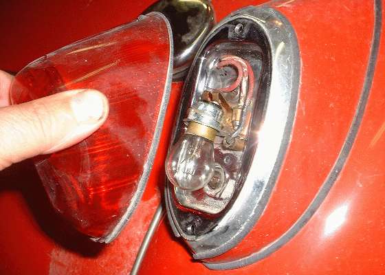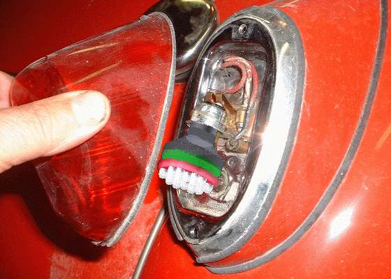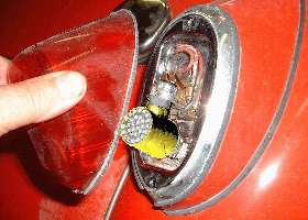 LED "bulbs": As of this writing in late 2004, LED "bulbs" are pretty much a lost cause for the MGA tail lights. The LED "bulbs" are built to project light, with the effective projection zone being a cone somewhere between 15 and 90 degrees wide, projecting a large bright spot on the back of your tail light lens, not seen well from the side. Even with the light directed in one general direction, these lamps are still (generally) not as bright as a standard incandescent brake light or turn signal bulb. The first (and so far only) commercial LED plug-in replacement for the 1157 bulb that actually is as bright in the projected direction is 1.85 inches in diameter (and costs nearly $50). In the MGA tail light assembly the bulb mounting is in a downward direction, not pointing out the back.
