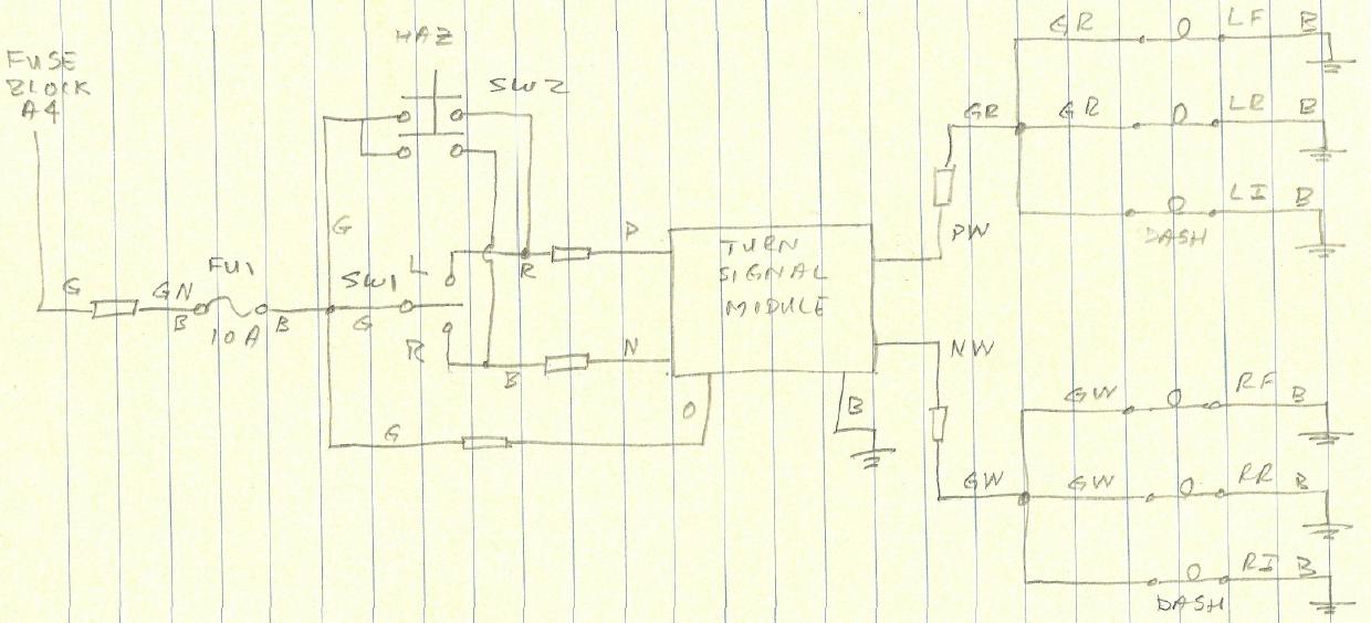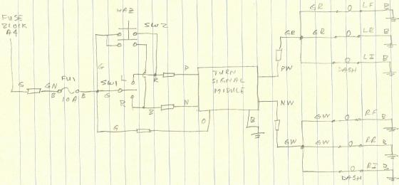 With the module, the flasher is not necessary. To bring 12v+ power in to the new dash switches, connect G to GN (bypassing the flasher), then connect GN to the new 10A circuit fuse. From the new 10A fuse, 12V+ then goes to the new turn signal switch (TSS - Littlefuse 75701) common and to the orange 12V+ Module wire. The left TSS connects to the purple, P, module wire, and the right to the black TSS wire. From the module, purple/white, PW, connects to the green/red, GR, wire, which is the left turn signal lamp circuit, and black/white, BW, connects to green/white, GW, which is the right turn signal lamp circuit.