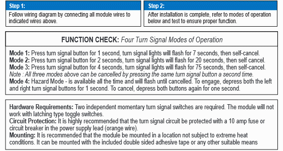 See wiring diagrams below. Someone's feedback note mentioned wiring diagram on the back of the module. There is no indication on the web site that these modules will not work with the earlier style turn signals where brake lamps are used for turn signals. Also it does not include the original safety feature where it stops blinking if a bulb is burned out or disconnected (as it is not load sensitive).