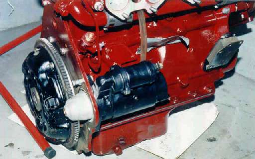 This picture (courtesy of Bill Spohn in West Vancouver, BC, Canada) shows the final alternative for the MGA. It is the Marina preengaged starter with solenoid on top on an early MGB 5-main engine. The flywheel is 1965-1967 issue, small diameter to fit the 3-synchro bellhousing, mated to the 5-main engine.