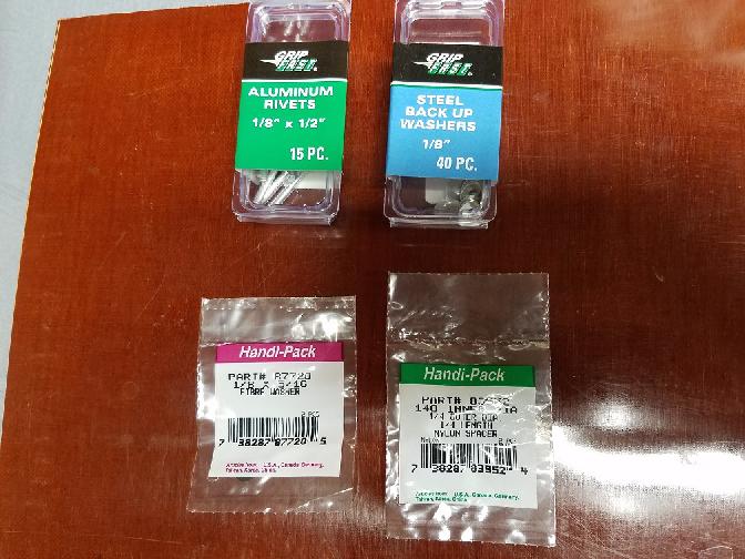 Then I got a 1/4 OD x 1/8 ID x 1/4 height nylon spacer (from Menards Hardware Store). And a 5/16 x 1/8" fiber washer (Menards). Then got 1/8" X 1/2" Rivet. I had a sheet of phenolic board (insulator board) that is 1/16" think.