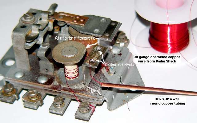 First we drilled out the rivets holding the contact plate. Then we ground down the fiberboard end of the electro-magnet to give some room to maneuver. After pulling off all the old wire I went to True Value Hardware and found just what I was looking for to feed the wire. 3/32 x .014 round copper tubing that I cut with a Dremel to about a 4 inch length. I threaded the wire through the tube and then started winding. I put about 12 layers of wire on the magnet. I took my time winding but it still only took about 20 minutes.
