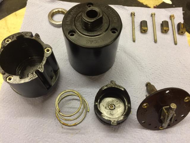 Notice here that the manual actuation shaft on the front is connected to a yoke holding a small cross bar. This bar rides in large "V" notches in the piston, such that the piston is pushed back as the bar is rotated. When the manual lever is released the piston can return forward and push the small bar back around to its center position shutting off the switch. The speed of this return is regulated by vacuum inside the body of the unit, this vacuum being gradually relieved by air being vented in through the center port at the rear of the unit, and that air flow rate being controlled by the small set screw.