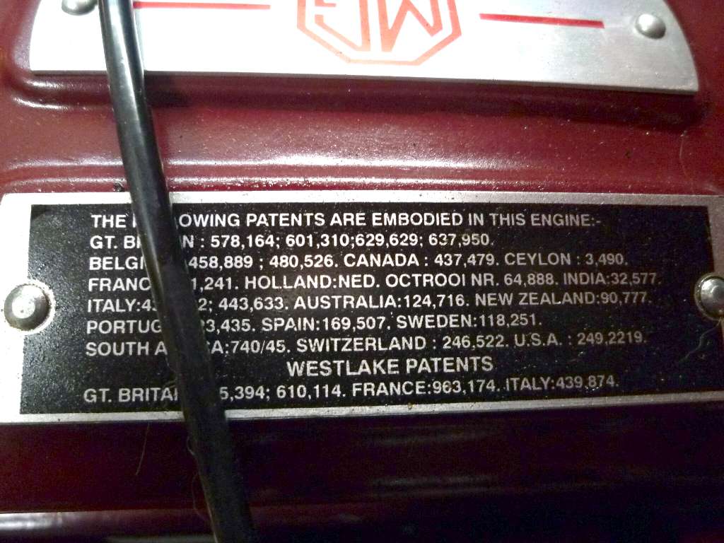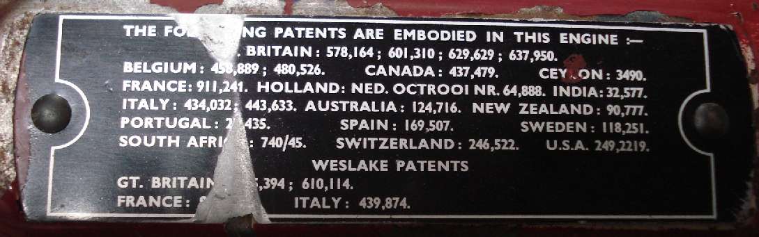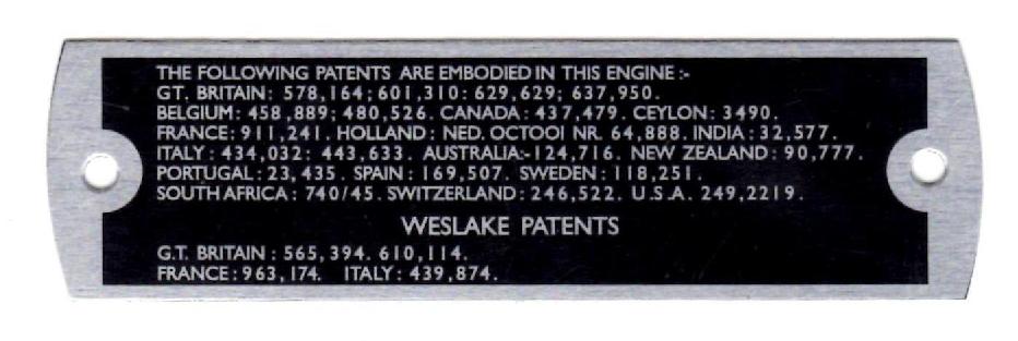 Additionally this shows what must be the correct original style of patent plate with left justified text and two lines below the (centered) "Weslake Patents" line. After being removed, these plates are pictured below. If anyone has a confirmed original patent plate that does not look like this one, please let me know.