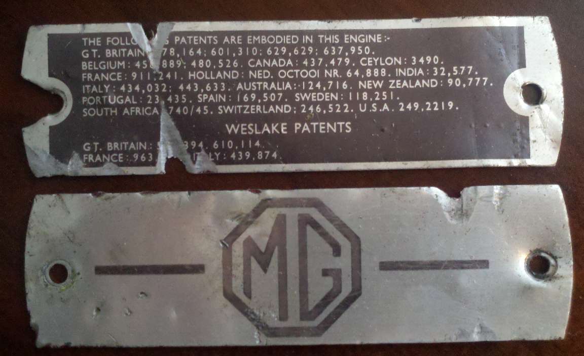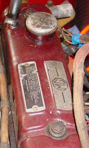 The valve cover plates should be positioned with the "MG" plate on the right (ignition side), the patent plate on the left (carburetor side), and both should be readable from their respective sides of the car.