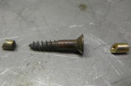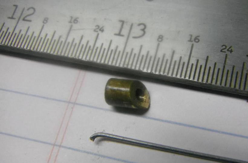 Photo at left shows the loose and worn restrictor after removal. Photo at right shows the old one and a new one which was made from a brass wood screw. The maker had cut the end at an angle to roughly match the worn part, but that is not necessary. Leave it square across, and press it in below the surface of the journal. It is important that the brass piece be tight interference fit so it cannot come loose with centrifugal force during high speed running.