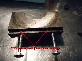 1.) Place cork strip over the slot. Place a piece of angle iron next to the cork against the bottom surface of the block, and squeeze it with a couple of clamps to make the cork bit as narrow as the slot. Then push the cork packing into place with a wide flat nose punch and hammer.