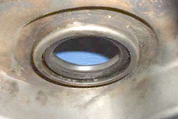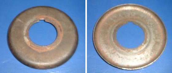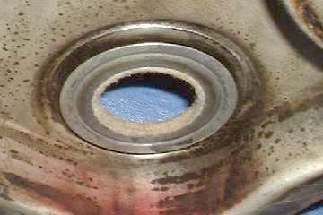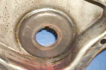 DO NOT use the original cup shaped MGA oil thrower with the later model MGB cover. This will rub and quickly chew a circular slot through the face of the cover making for a much worse oil leak. Been there and done that once before I knew better. The picture to right below shows just such a rub mark on the inside of the cover, cut half way through the sheet metal (click for larger picture).