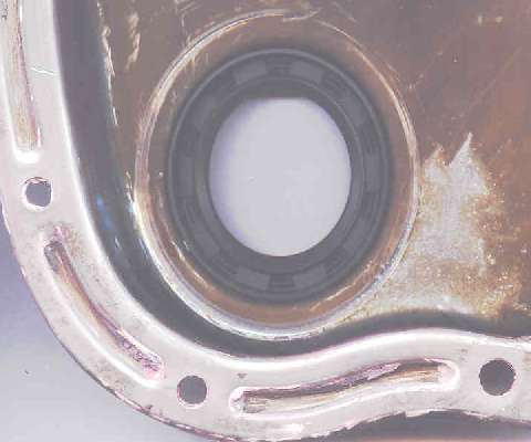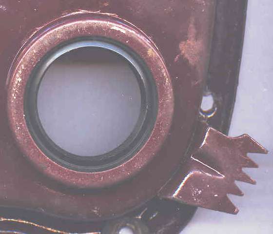 The oil thrower ring shown at right has a cup shape edge extending 3/16 inch forward, which extends into the pocket area around the packing gland. This disk is captured between the crankshaft timing sprocket and the hub of the front pulley, so it rotates with the crankshaft but does not touch the cover. (If the oil thrower ring is installed backward it will substantially interfere with the timing chain). When the engine is running this spinning ring throws oil away from the packing gland (flying off the front edge of the ring). Any oil running down the inside face of the timing cover is trapped in a groove surrounding the packing gland, and is therefore guided around the packing area to the bottom of the cover where it can return to the sump via a drain hole in the main bearing cap. As oil may puddle inside the bottom of the timing cover it is once again thrown away by the spinning disk. As such, you can think of the oil thrower as being a mechanical seal, while the felt packing is more of a dust excluder. This is actually very effective for keeping oil inside the engine while it is running (as long as there is no pressure in the crankcase).