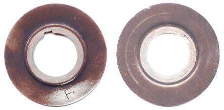 Pictures to the right show the 1965 and later MGB type oil thrower ring. This one is nearly flat with a small step just outboard from the sprocket hub. The ring is stamped with "F" on the front side. When properly installed the flange will be closer to the timing chain (but will not touch the chain). If this one is installed backward the flange might touch and rub on the inside of the cover.