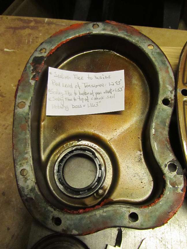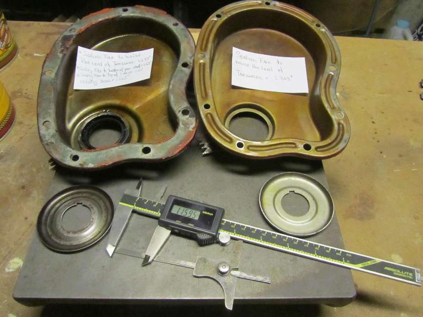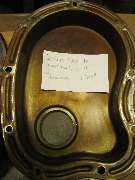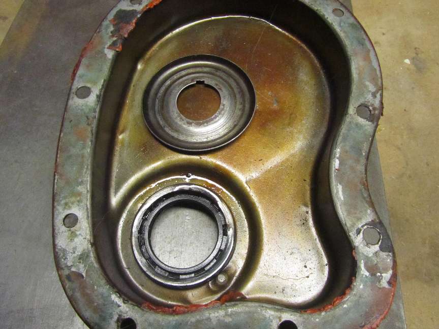 Looking inside the cover ( above center), the formed packing gland is soldered in place and is slightly more than 1/4 inch thick (about 0.26) including thickness of the outer shell. This is then approximately flush with the inside surface of the shell, leaving a 1-1/4 inch inside space from the gasket flange. It also leaves an inside pocket (a moat) surrounding the packing gland 3/16 inch deep. The picture above right shows the oil thrower ring positioned inside the timing cover, completely covering the packing gland.