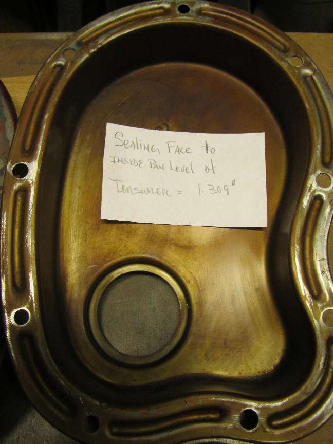 Notice the outer bolt flange is flat except for a small stiffening ridge turned up at the outside edge. Assembly calls for oval flat washers to be used to spread the load of the bolt over a larger area of the flange to reduce puckering of the metal around the holes. This pucker will inevitable occur to some extent anyway. Any time the cover is being re-installed you should tap down the raised metal around the holes with a flat faced hammer, and use a straight edge to check for flatness. If the puckered condition is left in place it may prevent sealing of the gasket.