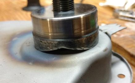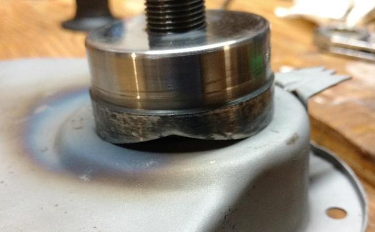 3. The cup ring that you removed from the inside of the cover is too small for the rubber seal (Moss # 120-000). Place the cup ring inside the cup of the chassis punch. Now screw the punch onto the cup inverted. Again centering is critical. Carefully draw the punch together for a depth of .290”. This will expand the cup ID to the correct size for the rubber seal. If you screw this up you can make a new on from 22 ga steel obtained from local hardware or home improvement store. (See additional note below).