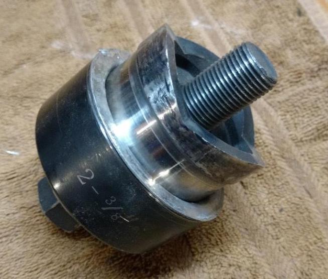 The rubber seal is intended to fit into 2-5/16" housing bore (2.312"). The heal of the punch shown above has been turned down in a lathe to 2.300" or 2.310" diameter. If you have a rubber covered seal it might be forced to fit into the smaller bore, but if you have a steel shell seal the bore size in the finished cover will have to be very close to 2.312" (original size).