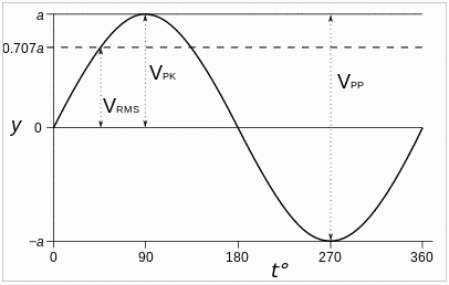 You might immediately recognize the 0.707 value as the sine (or cosine) of 45 degrees. RMS means "Root Mean Squared" which is a kind of mathematical average of the value of the variable equation, or in this case average height of the line on the graph (sort of). We know a rough surface is not a perfect sine wave, but this will serve as a decent illustration. In the graph, if V=1, then RMS=0.707V. The reciprocal is V=1.414RMS. Peak to peak on the sine wave is then 2.828RMS.