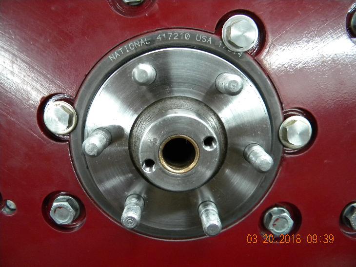 Notice three bolt heads on top of the special washers may be machined thin to clear the flywheel. No lockwashers here, use thread lock adhesive. Alternately the flywheel may be machined outboard of the pilot diameter to clear these bolts.