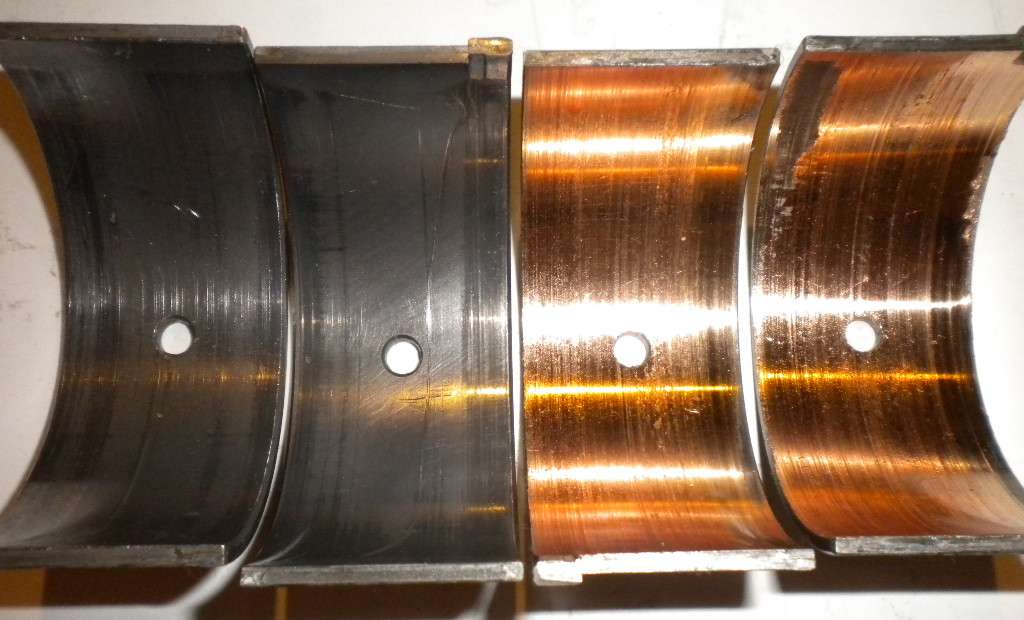 This photo shows connecting rod bearings in good condition (left) and badly worn (right) with all of the soft white metal worn away to expose the intermediate copper layer. The copper layer is very thin, so a little more running time would have the steel backing plate exposed to cause severe damage to the crankshaft rod journal surface.