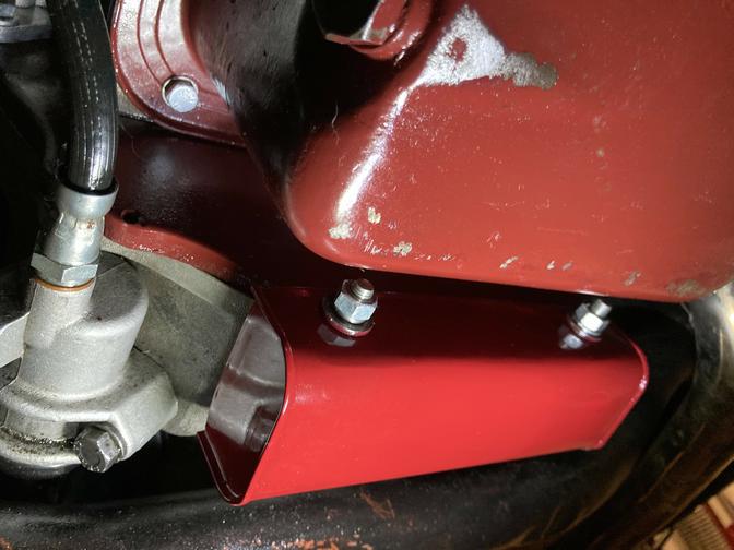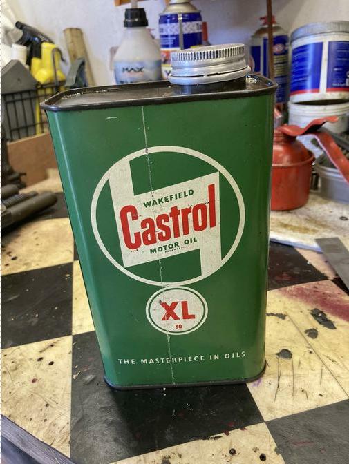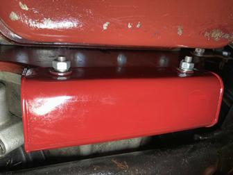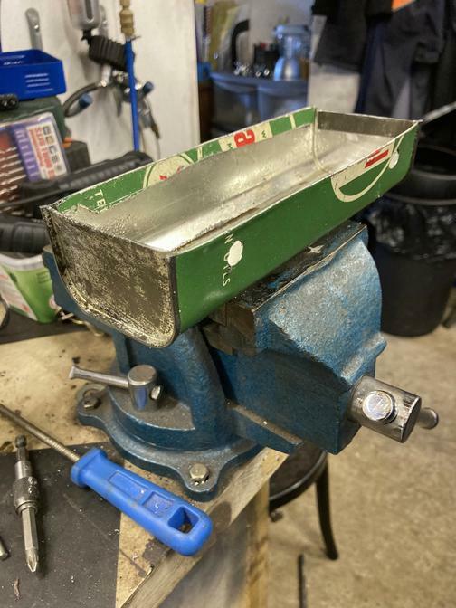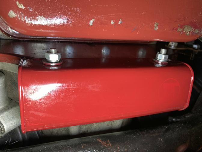 "I guess you have enough examples of oil catchers, but I'll offer mine up anyway. It's different in that instead of using the top of a gallon can complete with screw cap and handle, I used a vintage quart can cut length wise. I cut it to fit flush with the oil pan, avoiding the risk of damage. It fits snug up against the gearbox and is filled with absorbent cloth which can be removed and replaced periodically". -- Bill
