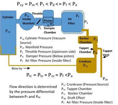 The air filter chamber is unique to the other chambers in the ventilation system, in that it has both a vacuum source and an atmospheric source as well as being connected to the crankcase. Even though it has its own flow, the pressure of the connected chambers will be additive and equal within the TC vent, crankcase to air filter.