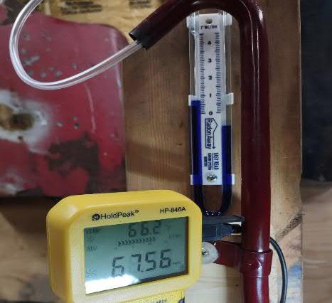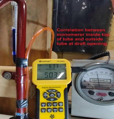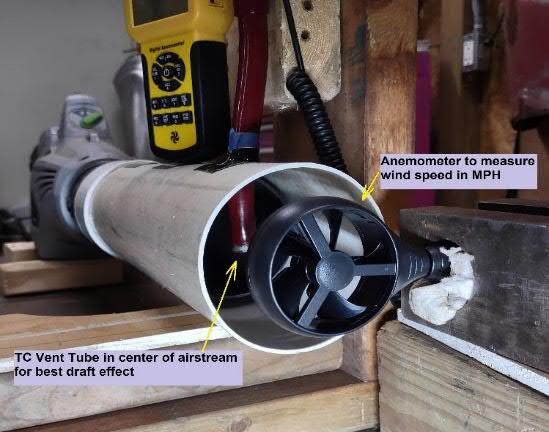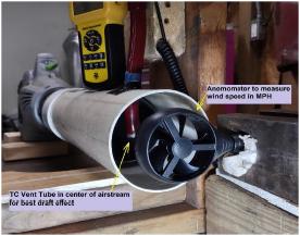 b. Measure the tube pressure generated by draft effect various speeds up to 60 MPH in the center of a 4” dia wind tunnel. This insures the best air stream with nothing blocking the output and no turbulence. The top of the TC tube is open to atmosphere in one test and blocked in another test so no other flows or pressures effect the measurement. Wind provided by variable speed leaf blower attached to 4” diameter tube.