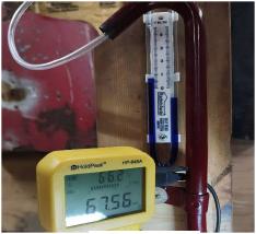 The photo to the left (Figure 13) shows correlation between gauges used in testing and verifies that the placement of the sample tube on the vent tube is correctly positioned for accurate, in vehicle use. The manometer tube gauge on the left matches the Dwyer gauge on the right and the air speed in the center is 50 mph.