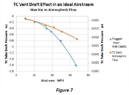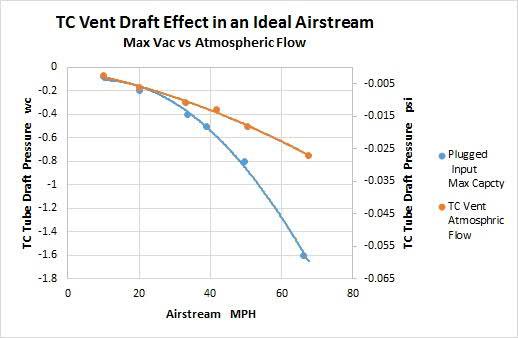 The graph (Figure 7) shows maximum capability of the TC vent tube draft effect, in an unrestricted air stream under ideal conditions. The plugged input data (blue line) shows capabilities of the draft to create vacuum with zero flow through the tube.