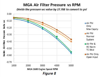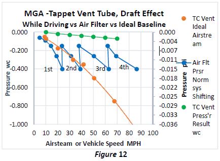 Note: Bad valve seats, guides and seals will allow blow-by into the rocker chamber increasing pressure, decreasing vacuum and input air, from the tappet vent. When the RC vent is connected to the air filter, the air filter chamber becomes part of the entire ventilation system and the pressures equalize throughout the entire system. Which means the air filter chamber is at the same pressure as the crankcase and inside the TC vent tube. Figure 8 proves that the air is drawn into the TC vent from atmosphere when stationary. How does the TC vent influence the system while driving?