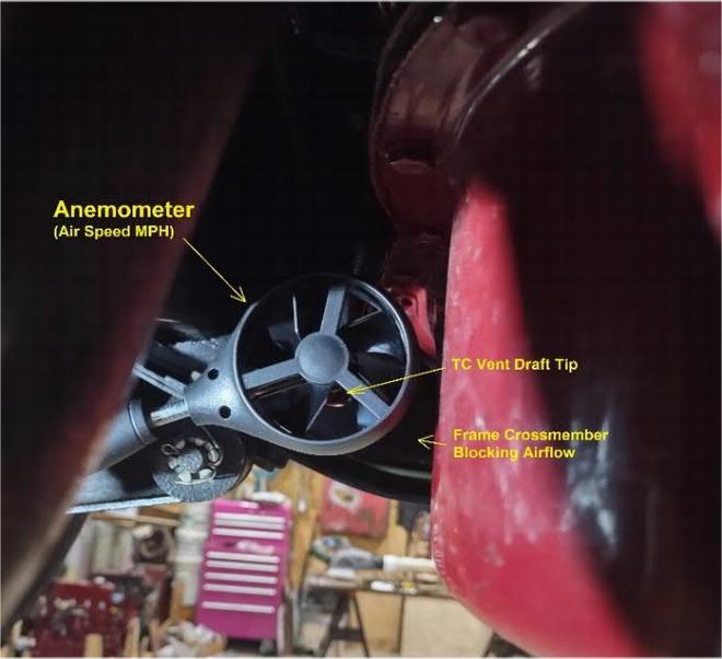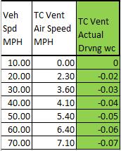 Observation: It was observed while driving, that if the clutch were pushed in (coasting) the wind speed measurement reacted to the throttle blips indicating that the engine fan was pushing air into the area behind the frame cross member around the TC vent opening and had more influence than the vehicle speed. Data was only taken with clutch pedal released and steady throttle.